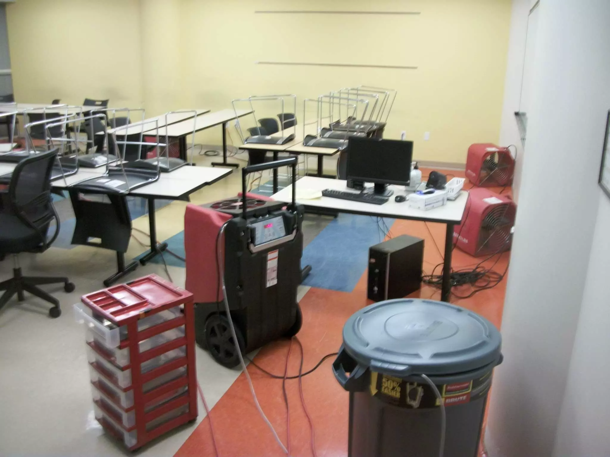 Reynolds Restoration Services provided water restoration services to the Brandywine Realty Trust at a facility in Silver Spring, Maryland. A large flow of water from a failed heat pump condenser on the third floor affected 22 classrooms/offices on three floors. Cubicles and partitions within the rooms made air circulation during the drying out process a challenge.
